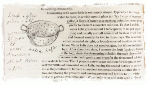 Sono istruzioni diverse, diversissime anche da quelle del suo libro tradotto in italiano per i tipi del Gambero rosso, in cui addirittura usa il miele in prima fermentazione, soprattutto quanto alle proporzioni di grani e zucchero per litro di acqua (attenzione leggete l’altro post per tutto il resto, è importante) e, un dettaglio di non poco conto, circa l’indifferenza di questi organismi in simbiosi, alla presenza di aria/ossigeno.