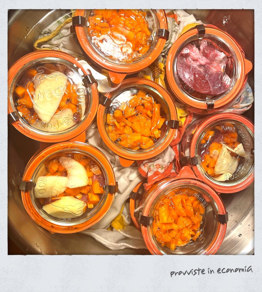 L’autore usa i vasi ‘Le Parfait’ da 750 ml ognuno, ed usa una capiente pentola per pastorizzarli a bagnomaria.