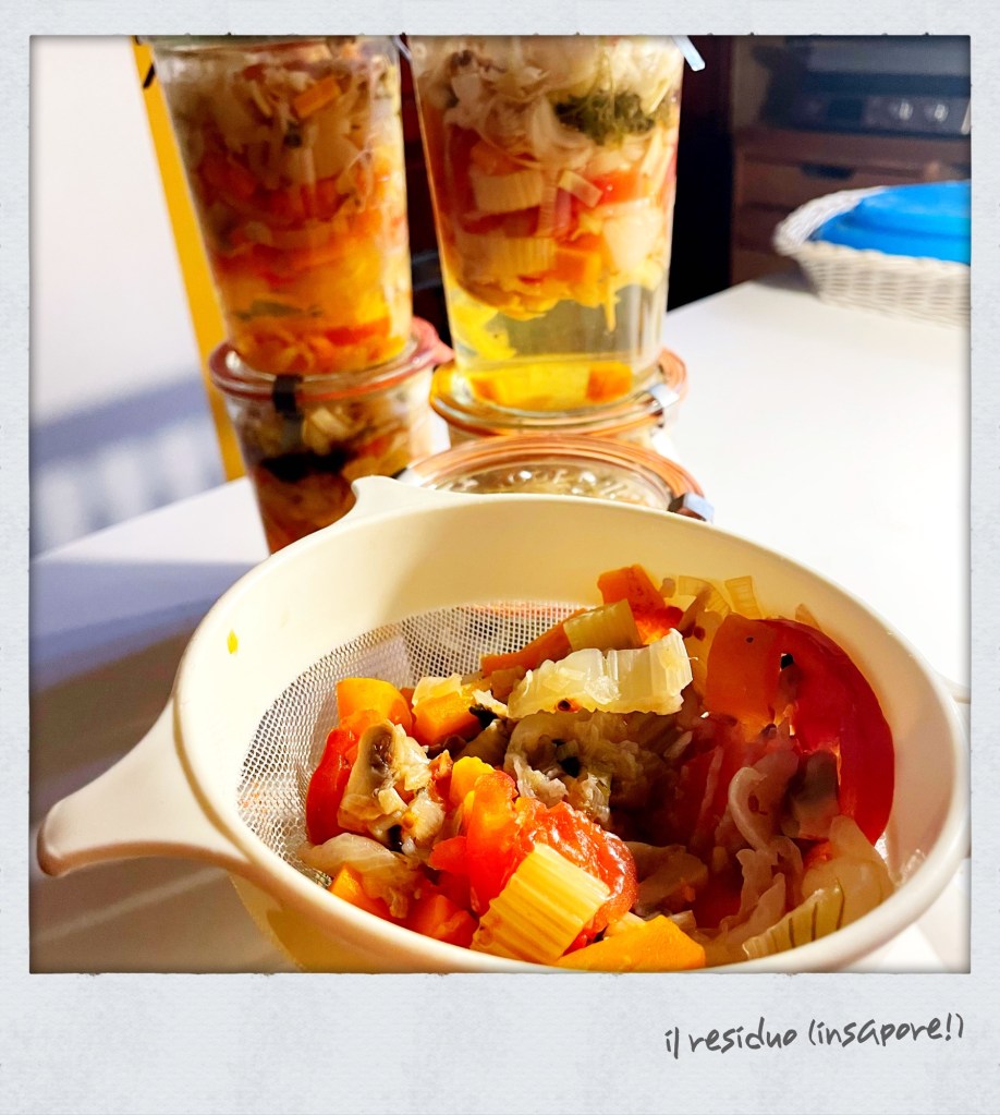 Ora vi racconto (non badate alla didascalia sotto la foto del residuo solido, ristrette e saltate in padella, con poco olio, quelle verdurine sono ottime, tutt’altro che insapori).