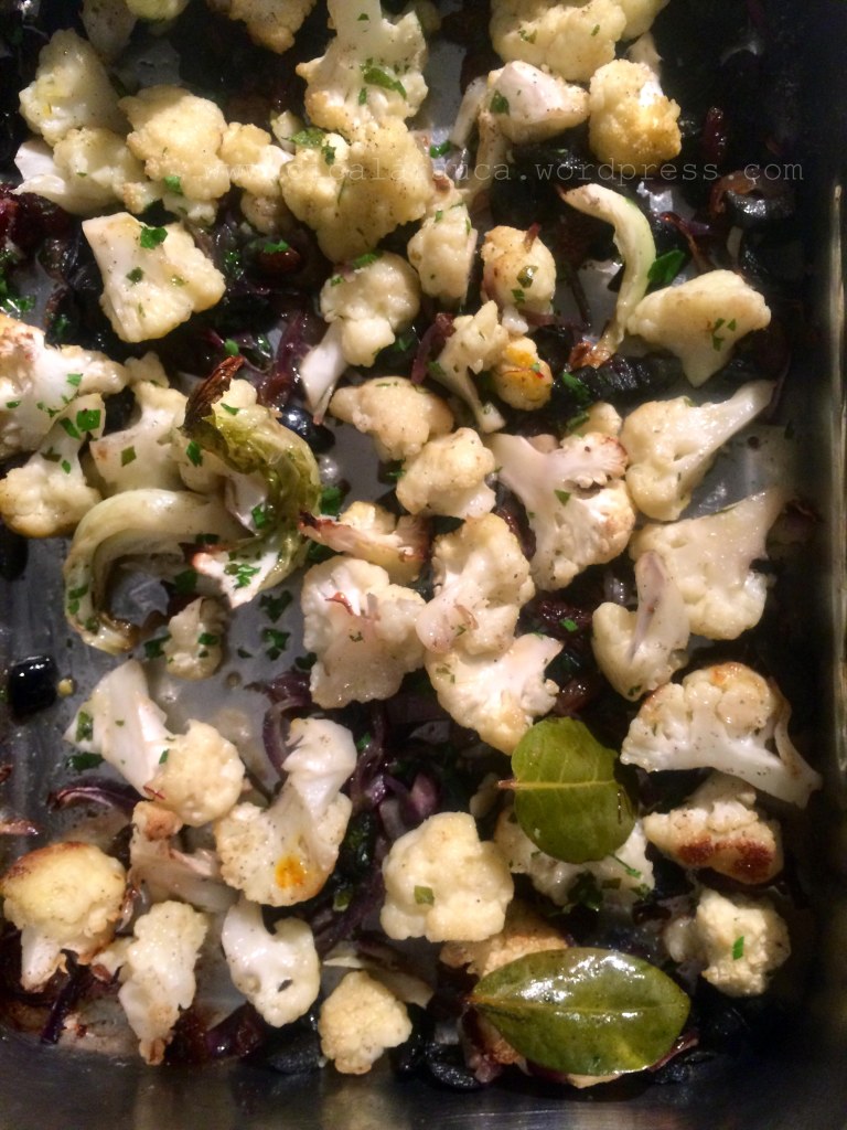 Trasferite il tutto in una pirofila (io in una teglia di acciaio), coprite con un foglio di alluminio e infornate. Cuocete per 40-45 minuti o fino a che il cavolfiore diventa tenero, non molle, conservando compattezza. A metà cottura togliete la pirofila dal forno e rimestate bene, ricoprite e infornate nuovamente. Leggo di ricette che citano a Plenty e sono leggermente diverse nei quantitativi, oppure nel procedimento in forno, in cui si scrive di rimuovere, a metà cottura, il foglio di alluminio a protezione. Io lo faccio seguendo Plenty, in questa edizione, può darsi che il riferimento delle altre ricette sia alla seconda edizione.